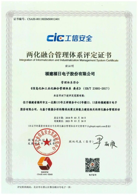 2018年3月30日,福建福日電子股份有限公司獲得了工信部兩化融合管理體系評定證書。公司2017年6月啟動(dòng)兩化融合管理體系貫標(biāo),打造信息化環(huán)境下的新型能力——基于數(shù)據(jù)分析的精準(zhǔn)決策支持能力,并于2017年8月列入工信部“2017年兩化融合管理體系貫標(biāo)試點(diǎn)企業(yè)名單”。通過本質(zhì)貫標(biāo),公司在福建省電子信息集團(tuán)系統(tǒng)先行先試,率先通過兩化融合管理體系貫標(biāo)評定。公司將不斷完善兩化融合管理體系,促進(jìn)兩化融合建設(shè)成果深化應(yīng)用,提升公司核心競爭力。