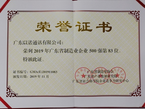 2019年11月13日,由廣東省制造業(yè)協(xié)會、廣東省產(chǎn)業(yè)發(fā)展研究院、廣東省社會科學(xué)院企業(yè)競爭力研究中心共同主辦的2019廣東省制造業(yè)發(fā)展年會暨廣東制造業(yè)500強企業(yè)峰會在廣州隆重舉行,會上發(fā)布了2019年廣東省制造業(yè)500強企業(yè)研究報告,福日電子二級控股子公司廣東以諾通訊有限公司榮列2019年廣東省制造業(yè)企業(yè)500強第83位。