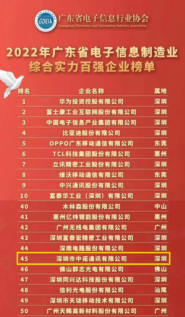 近日,廣東省電子信息行業(yè)協(xié)會發(fā)布了2022年廣東省電子信息制造業(yè)綜合實力百強企業(yè)榜單。福日電子成員企業(yè)深圳市中諾通訊有限公司憑借在電子信息制造行業(yè)的前沿實力,連續(xù)兩年入選廣東省電子信息制造業(yè)綜合實力百強,位列2022年百強企業(yè)第45位。
